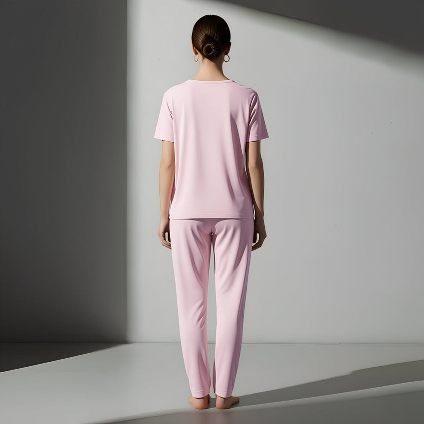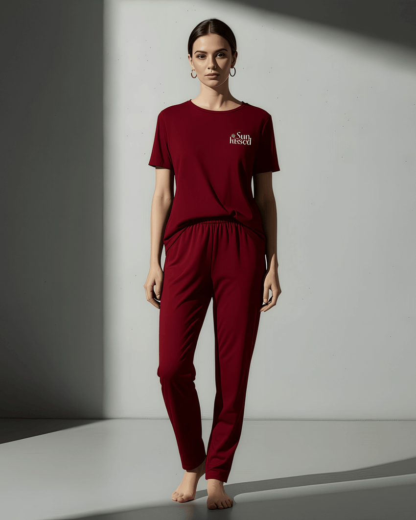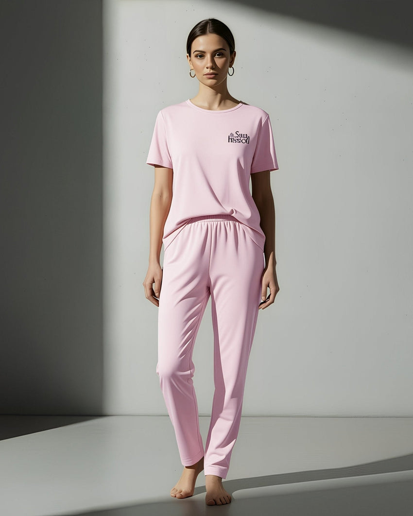 قماشه القابل للتهوية ناعم على البشرة ويحافظ على شكله غسلة تلو الأخرى، مما يجعله خيارك الأمثل للاسترخاء والنزهات غير الرسمية. يتناغم التيشيرت المريح تمامًا مع البنطال المطابق، ليمنحك إطلالة متناسقة دون المساس بالراحة.