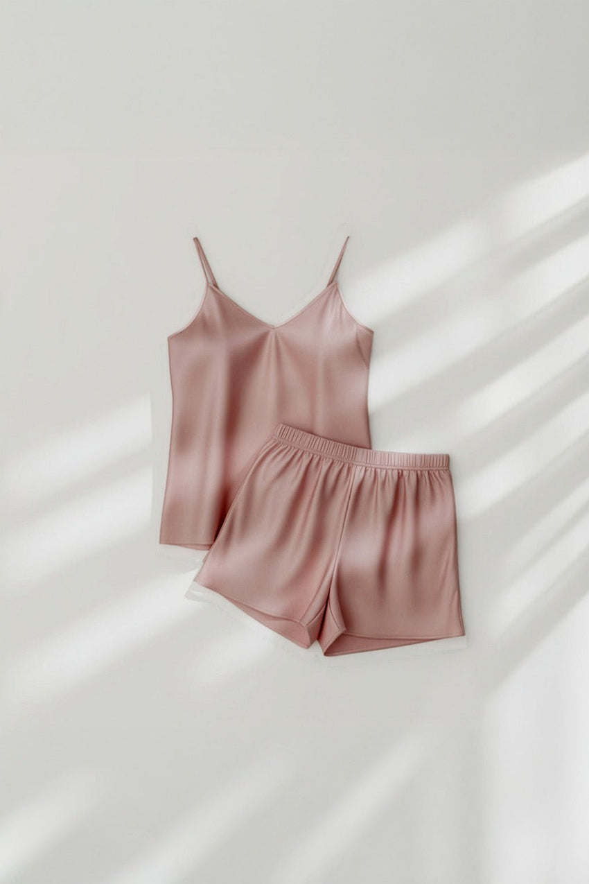 طقم بيجامة من شورت حريري بتصميم كاميسول - لون وردي مغبر + (ربطة شعر مجانية)