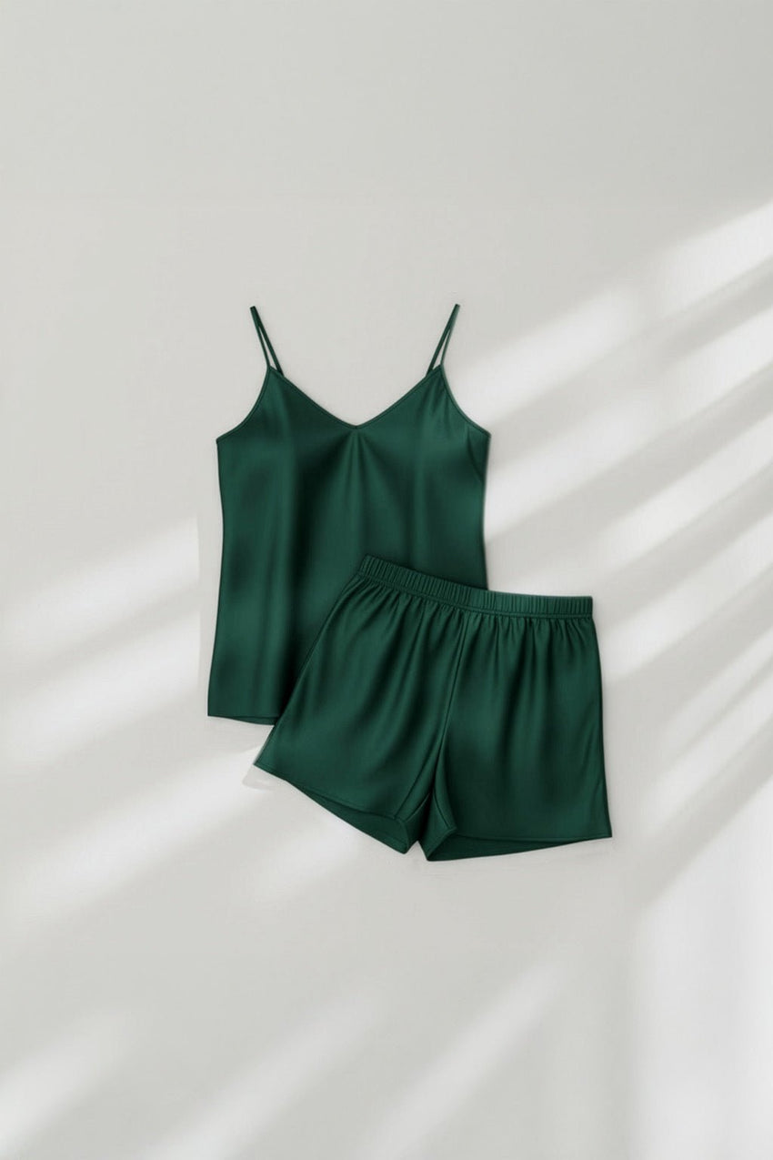 طقم بيجامة من شورت حريري ساتان بتصميم كاميسول - أخضر + (ربطة شعر مجانية)