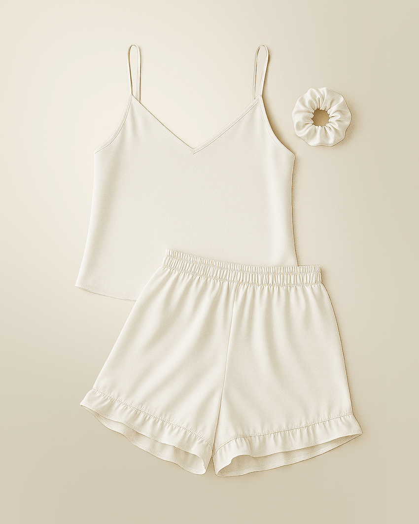 استرخِ براحة تامة مع طقم شورتات كامي ستايل، المصنوع من الساتان الذي ينساب بسلاسة ونعومة فائقة على بشرتك. صُمم هذا الطقم ليجمع بين الراحة والأناقة، وهو مثالي لصباحات دافئة ومريحة في المنزل.