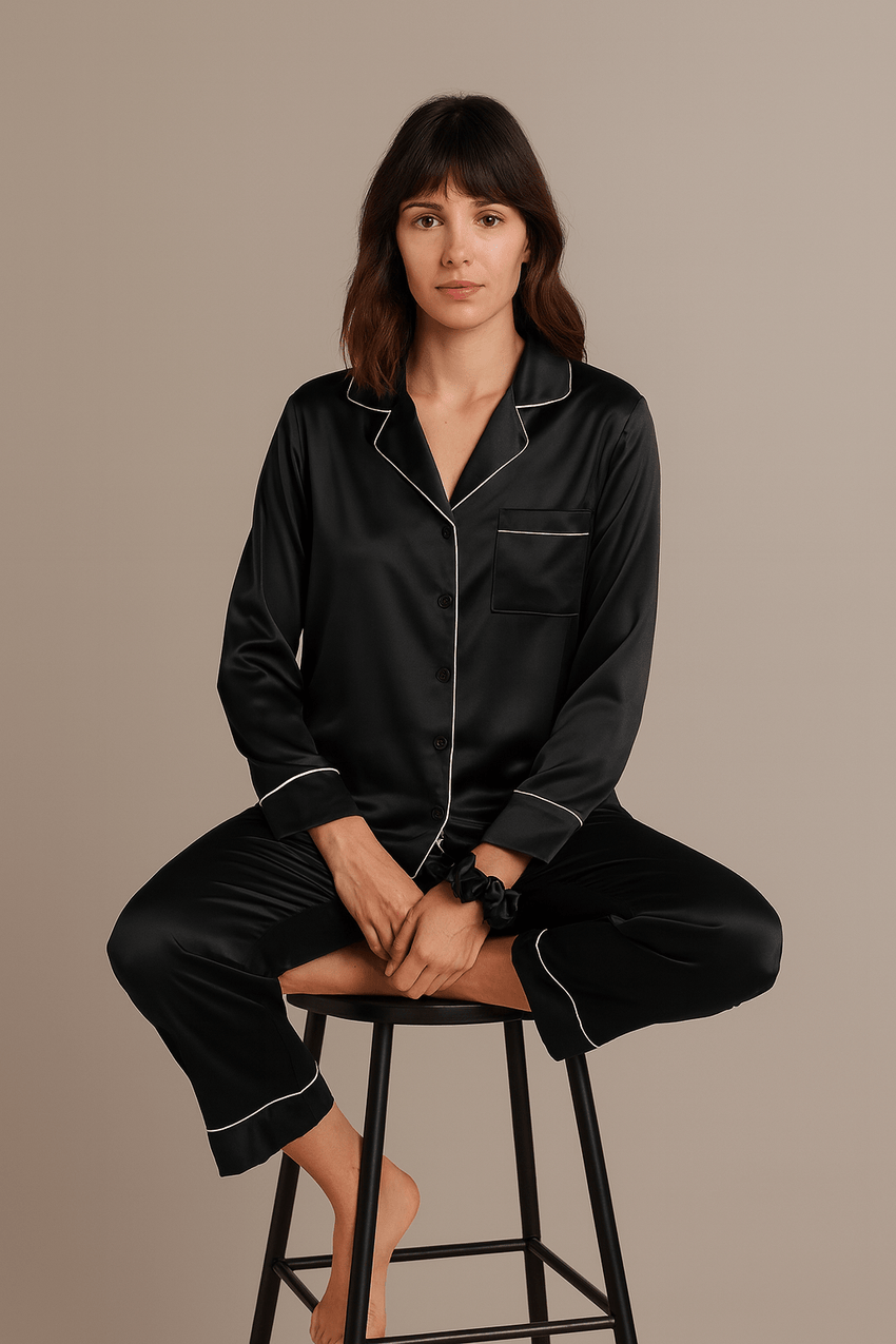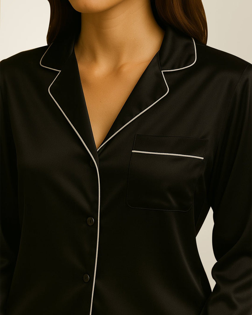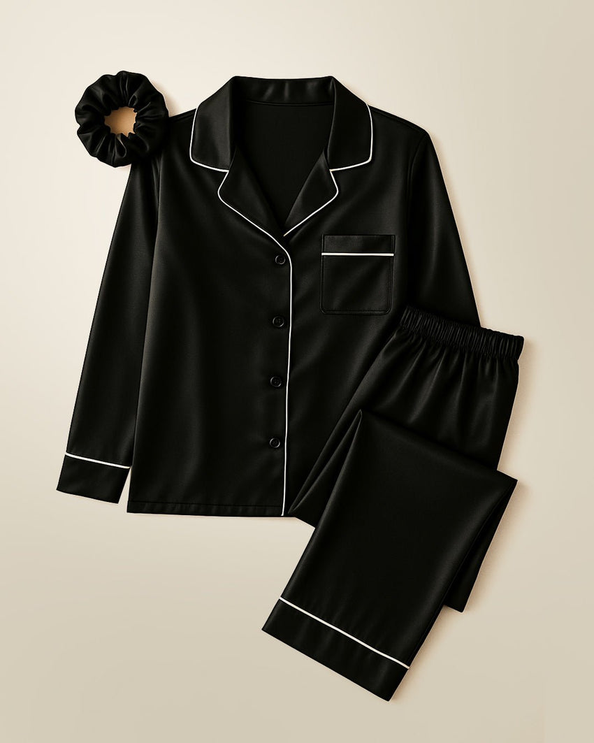 طقم بيجامات حريري بأزرار - أسود (ربطة شعر مجانية)