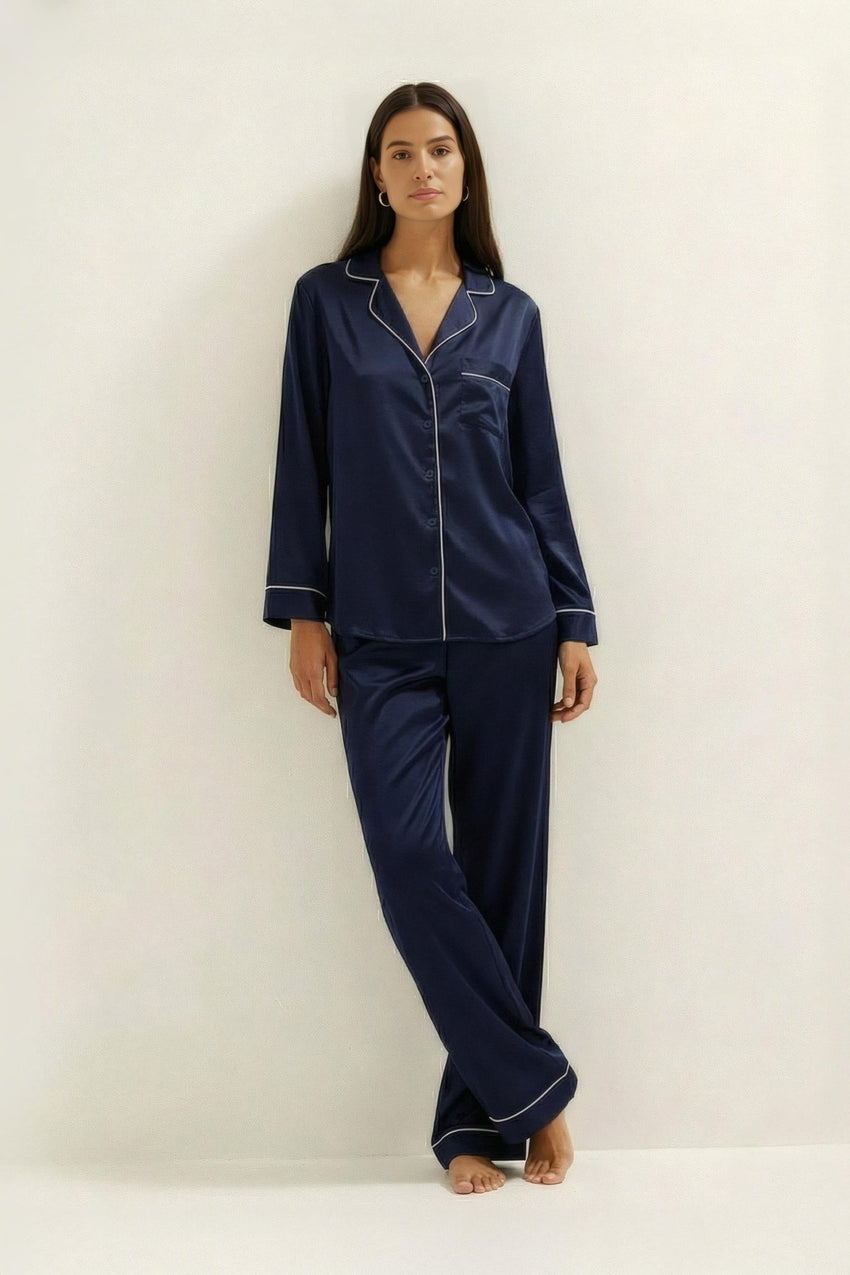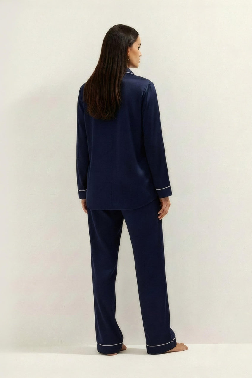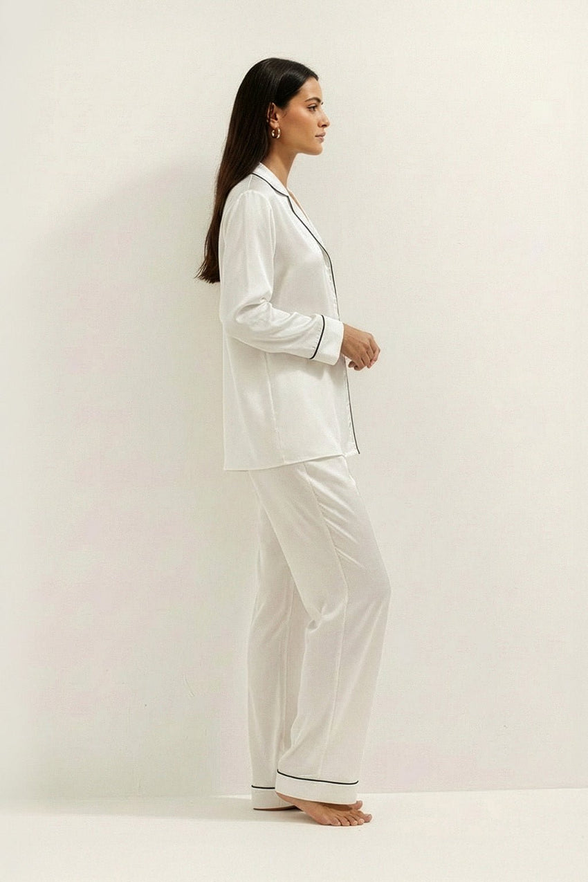 استرخِ براحة تامة مع طقم بيجاماتنا المزود بأزرار، المصنوع من قماش حريري ناعم الملمس، ينساب بسلاسة على بشرتك. صُمم هذا الطقم ليجمع بين الراحة والأناقة، وهو مثالي لأمسيات دافئة في المنزل أو صباحات هادئة في المنزل.
