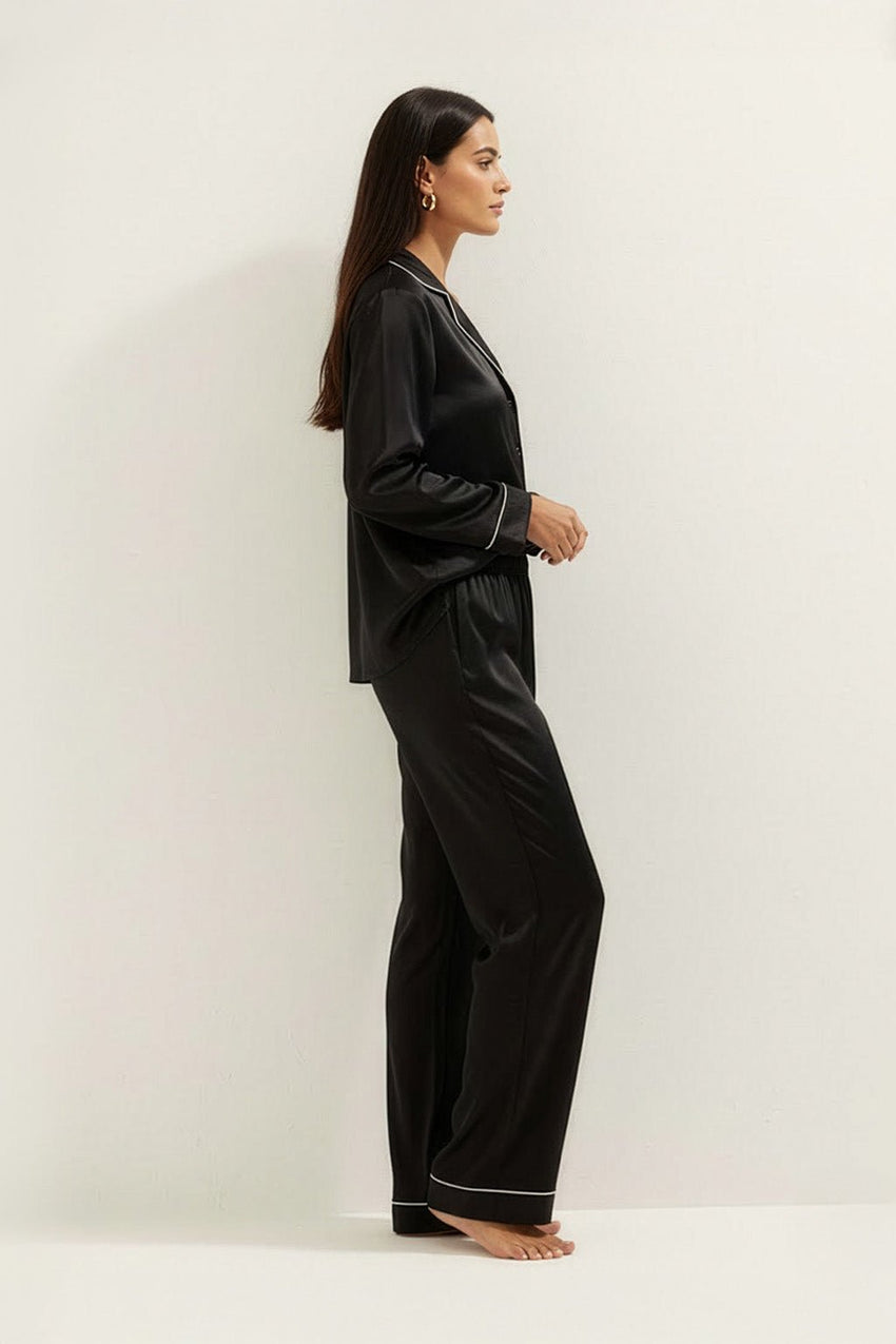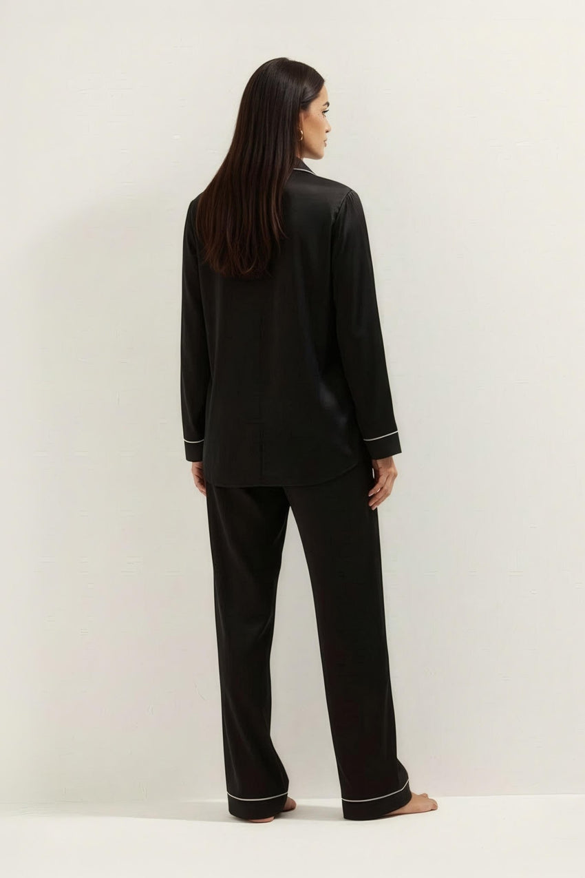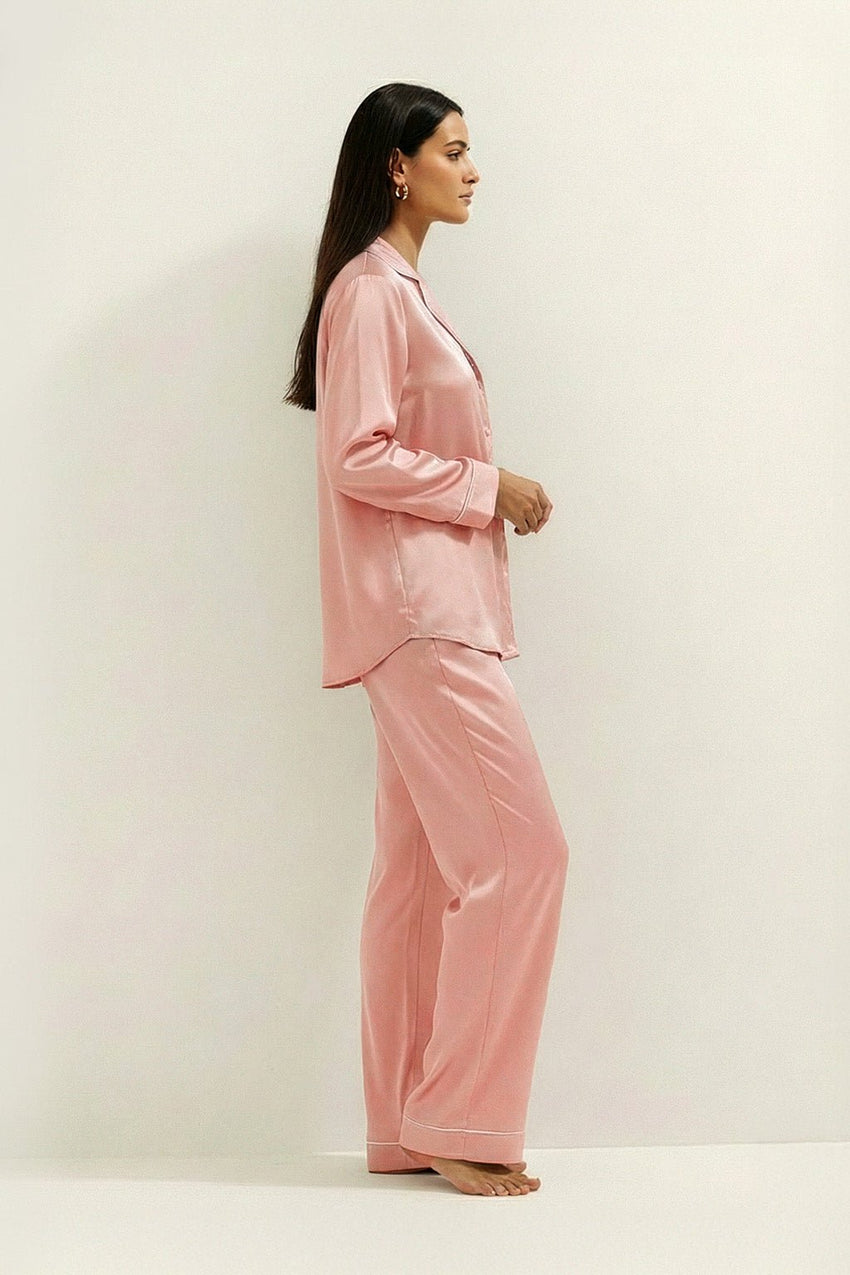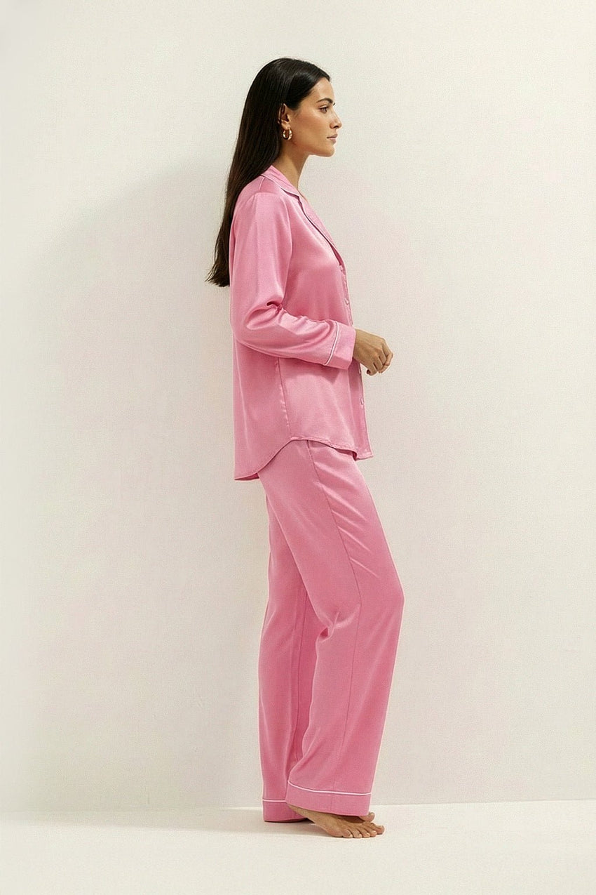 استرخِ براحة تامة مع طقم بيجاماتنا المزود بأزرار، المصنوع من قماش حريري ناعم الملمس، ينساب بسلاسة على بشرتك. صُمم هذا الطقم ليجمع بين الراحة والأناقة، وهو مثالي لأمسيات دافئة في المنزل أو صباحات هادئة في المنزل.