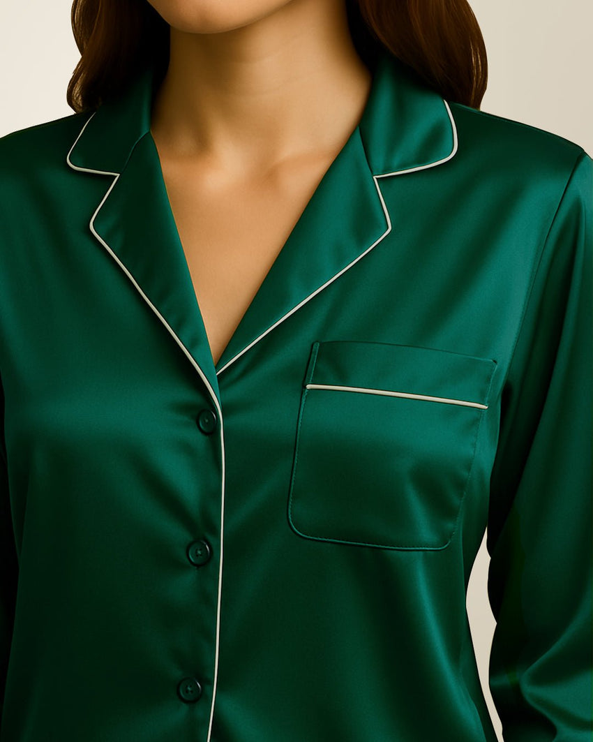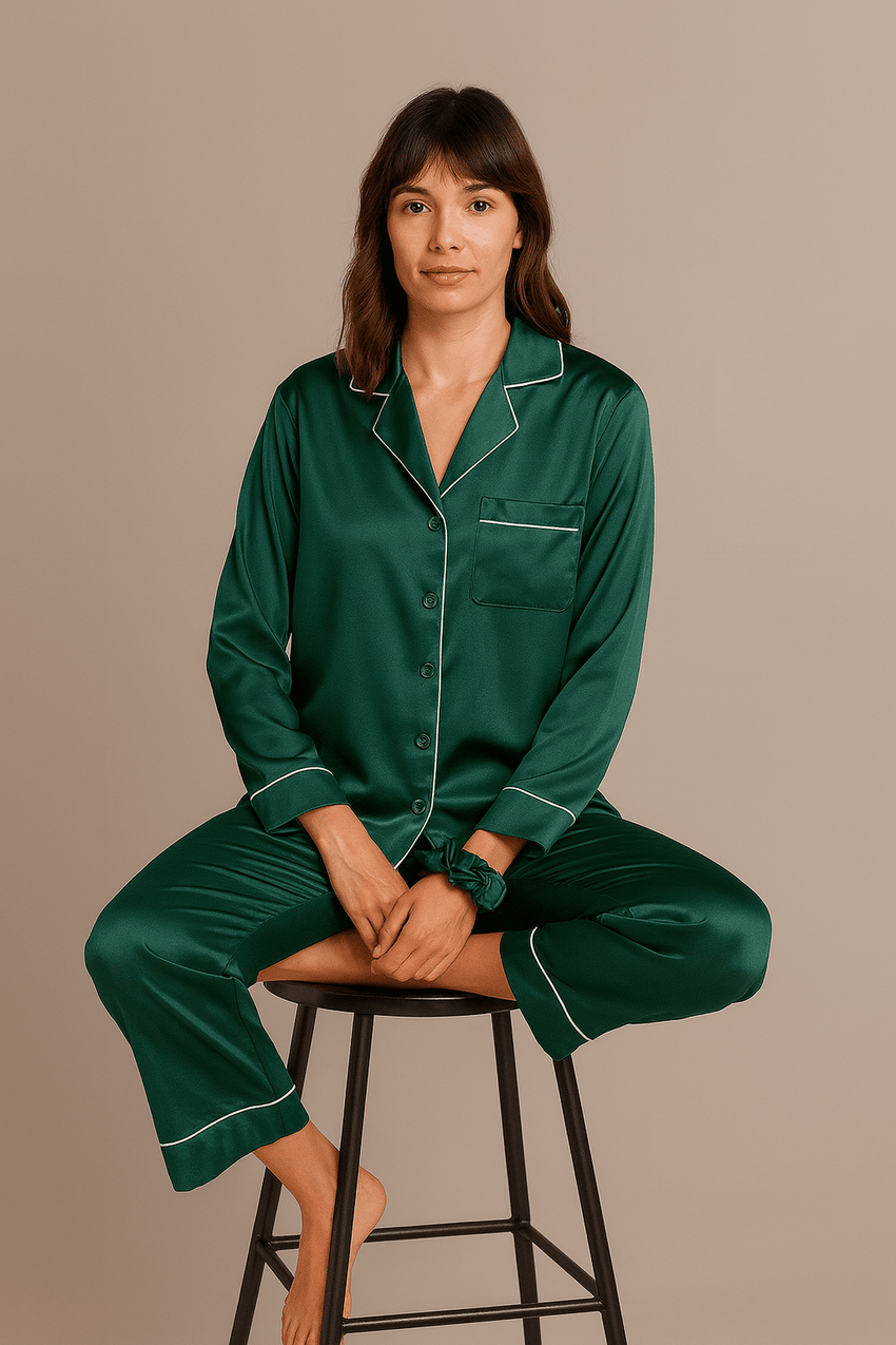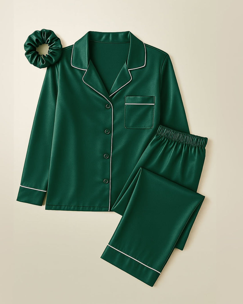 طقم بيجامات من الحرير والساتان - أخضر + (ربطة شعر مجانية)