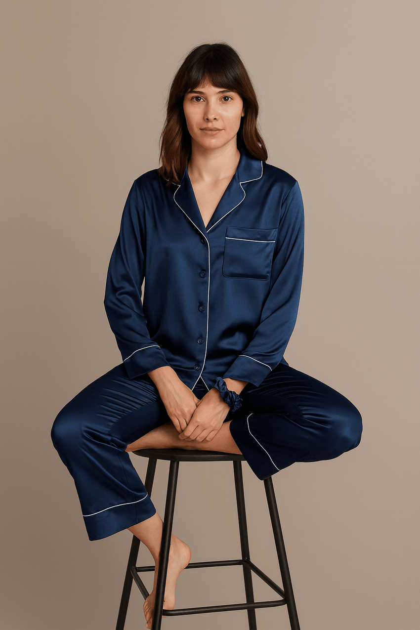 طقم بيجامة من الحرير والساتان - أزرق داكن + (ربطة شعر مجانية)
