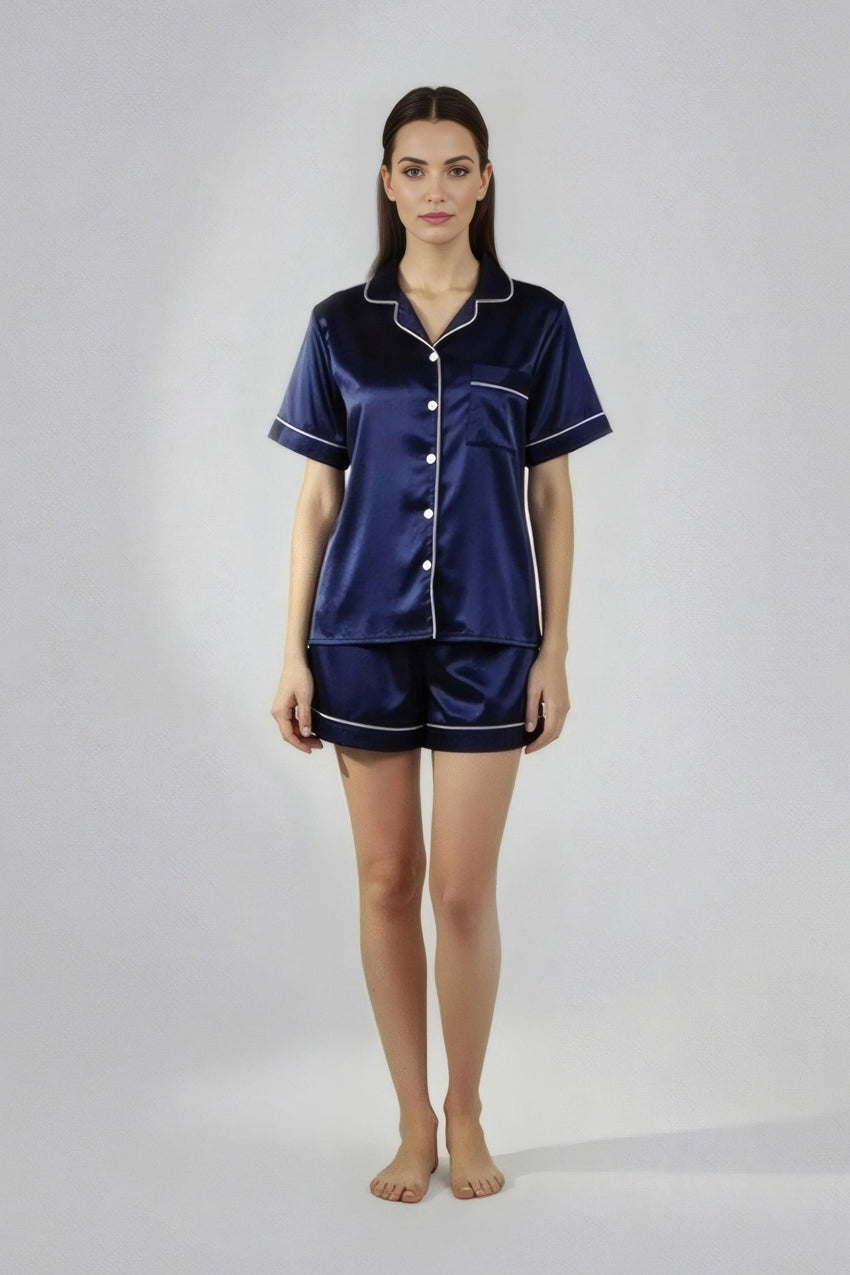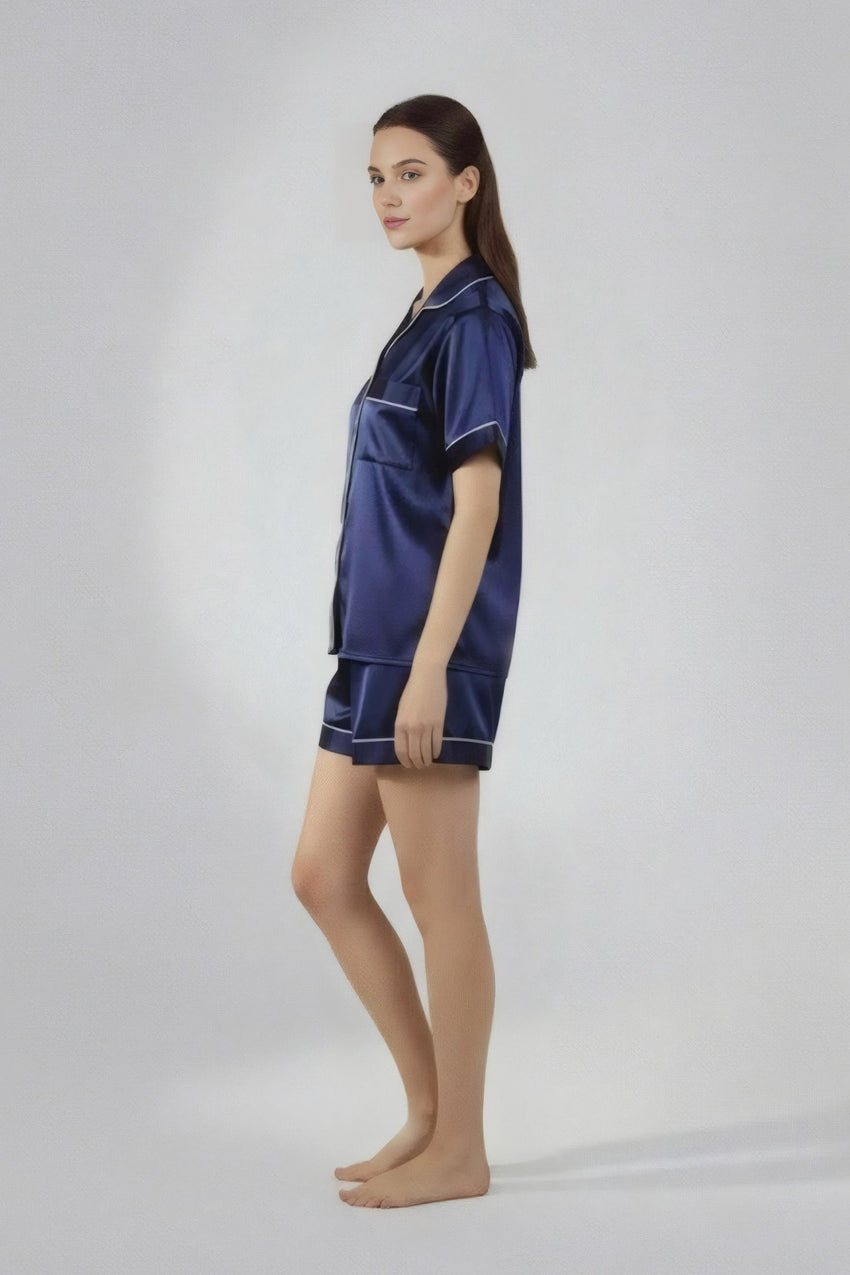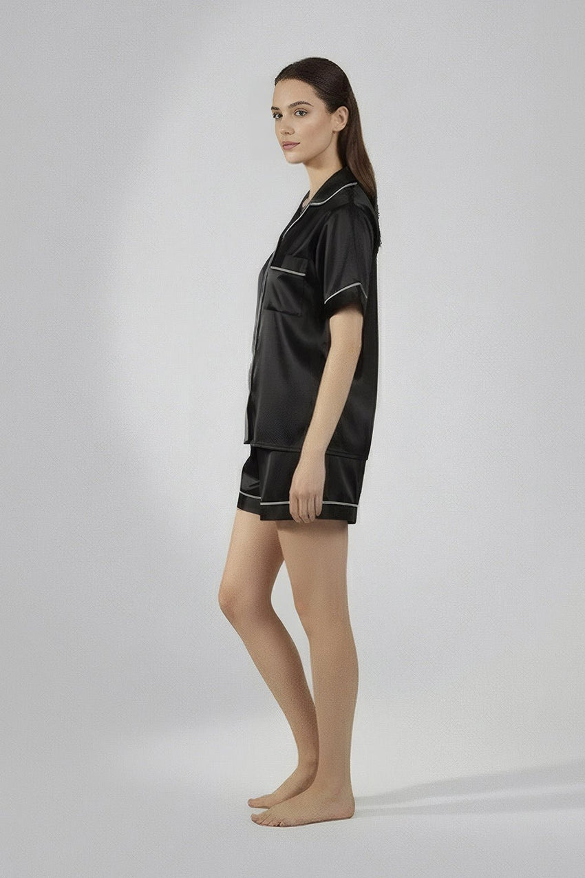 استرخِ براحة تامة مع طقم شورتاتنا بأزرار، المصنوع من قماش جيرسي بوليستر أنيق وناعم على بشرتك. صُمم هذا الطقم ليجمع بين الراحة والأناقة، وهو مثالي لأمسيات دافئة في المنزل أو صباحات هادئة في المنزل.
