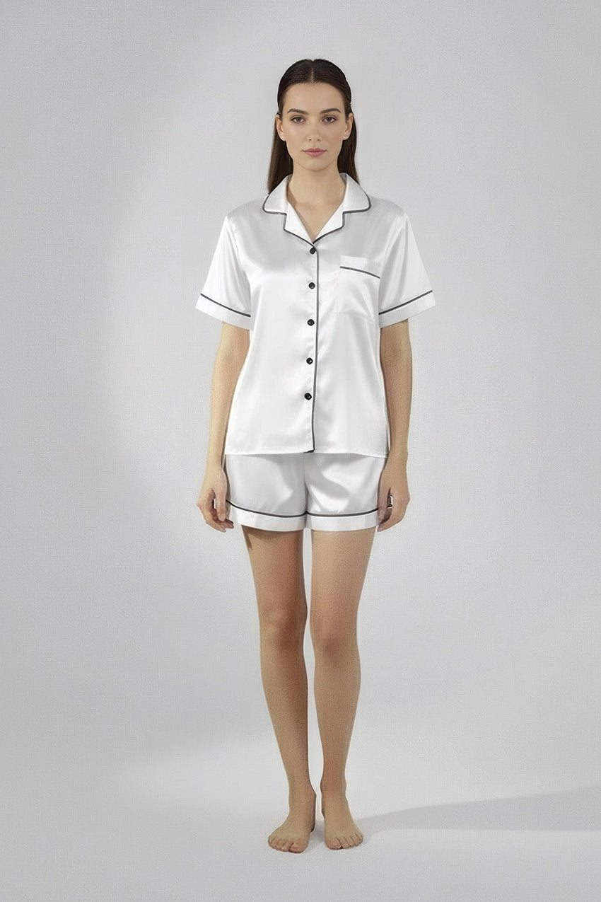 يتناسب الجزء العلوي الكلاسيكي المزود بأزرار بسهولة مع السراويل القصيرة المتطابقة للحصول على مظهر أنيق وخالد.