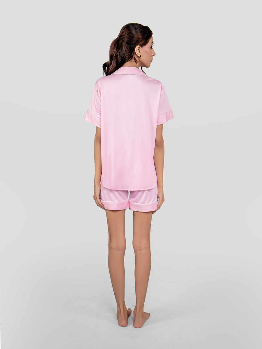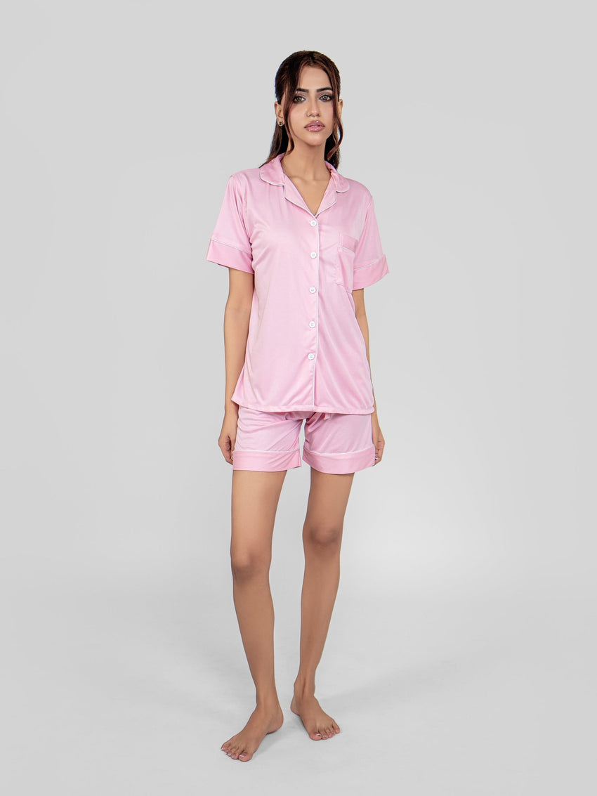 1 × بلوزة بفتحة رقبة على شكل طية صدر السترة وأكمام نصفية وحواف مزخرفة بجيب أمامي + 1 × شورت