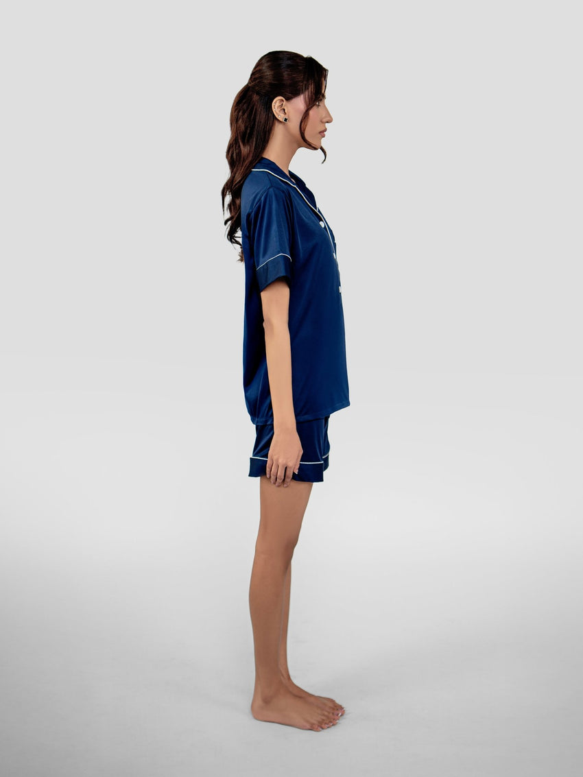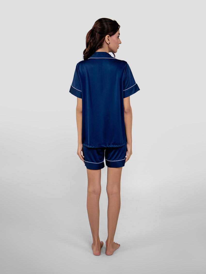 1 × بلوزة بفتحة رقبة على شكل طية صدر السترة وأكمام نصفية وحواف مزخرفة بجيب أمامي + 1 × شورت