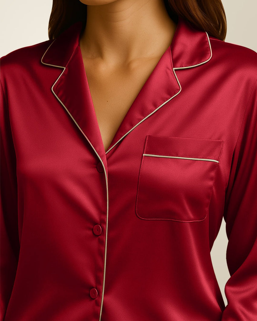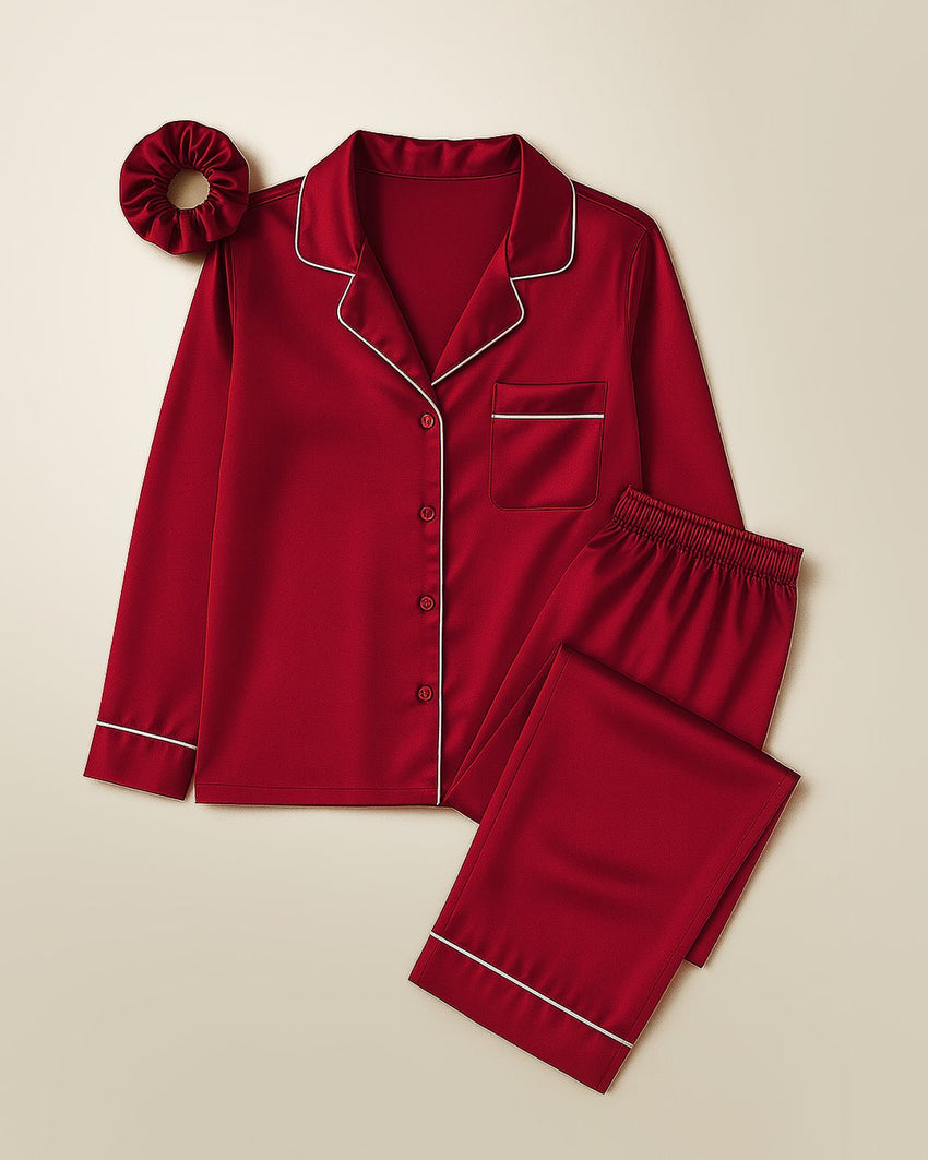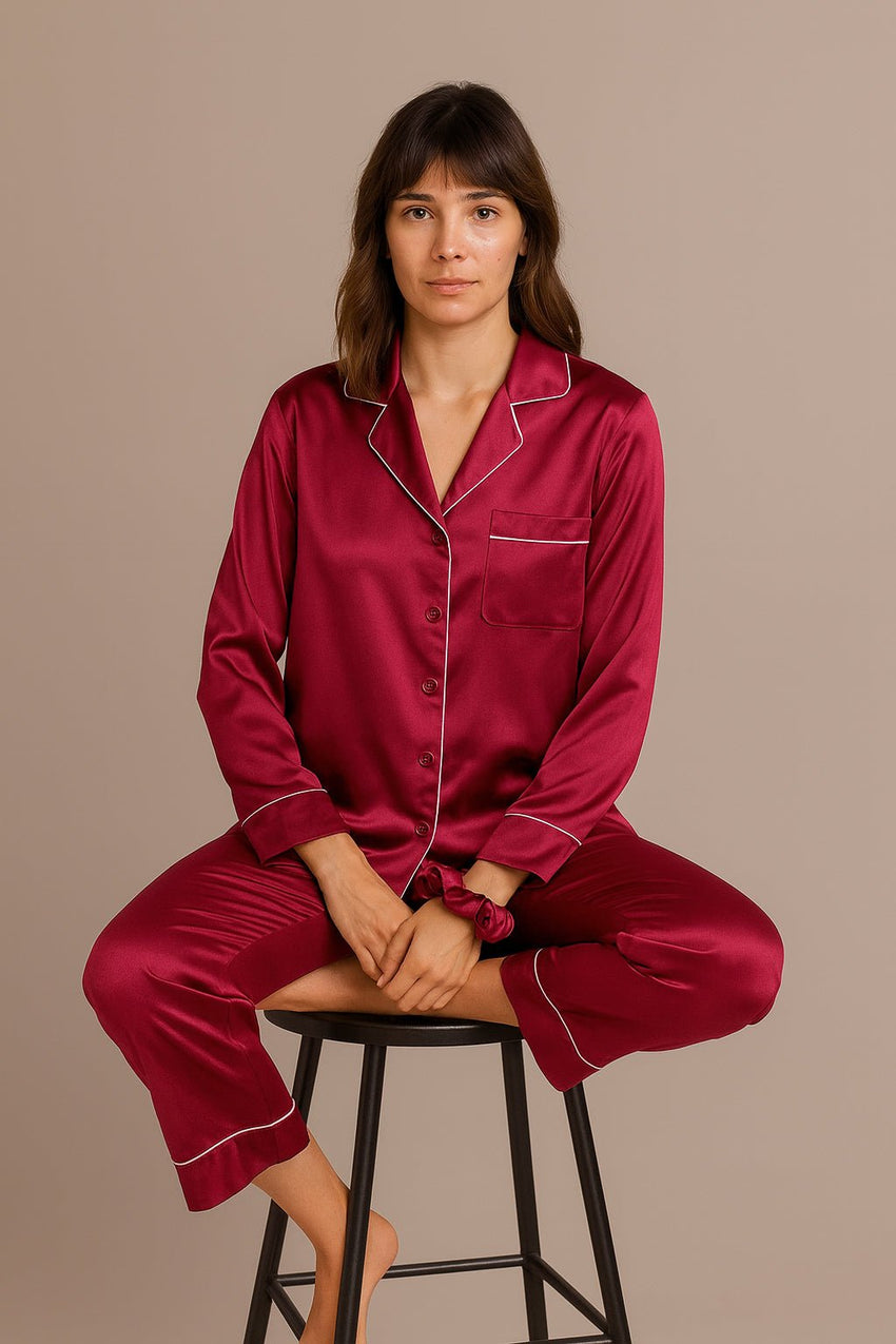 طقم بيجامات من الحرير والساتان - نبيذ أحمر + (ربطة شعر مجانية)