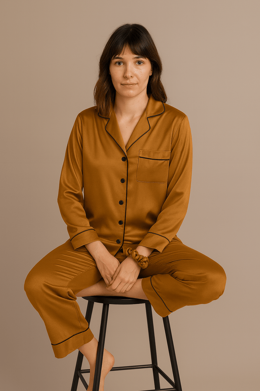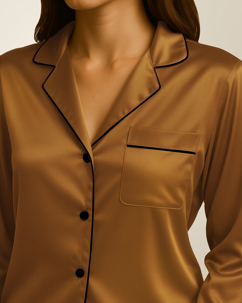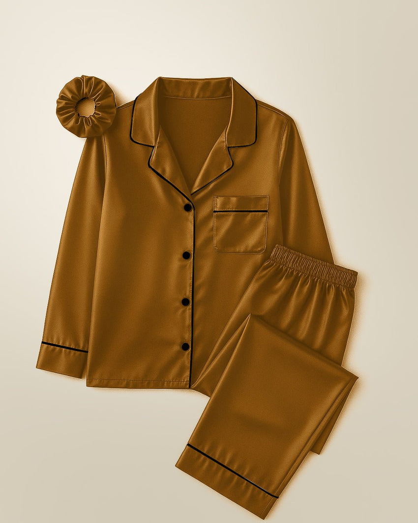 طقم بيجامة من الحرير والساتان - بني جملي + (هدية مفاجئة مجانية)