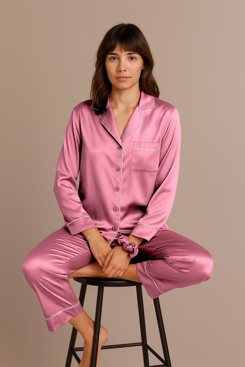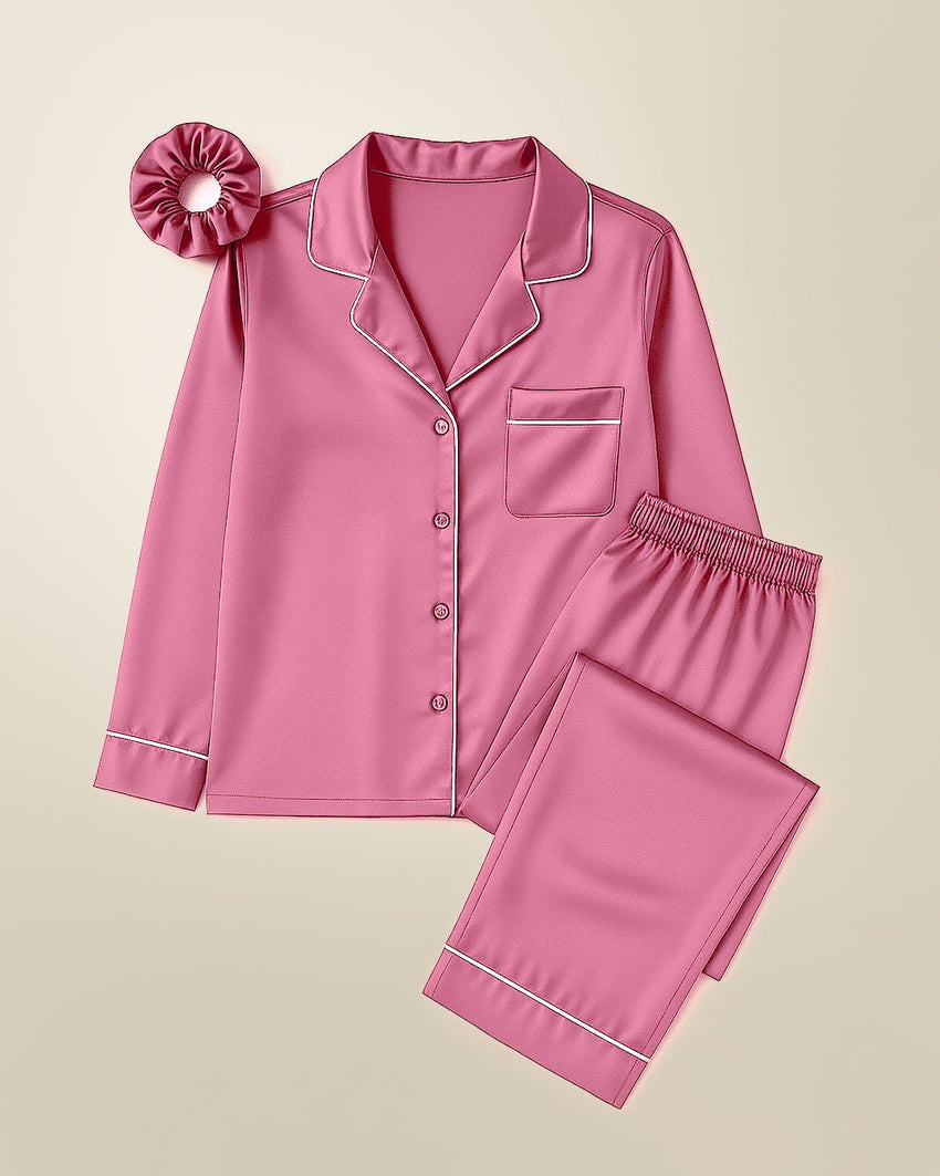 طقم بيجامات من الحرير والساتان - وردي غامق + (ربطة شعر مجانية)