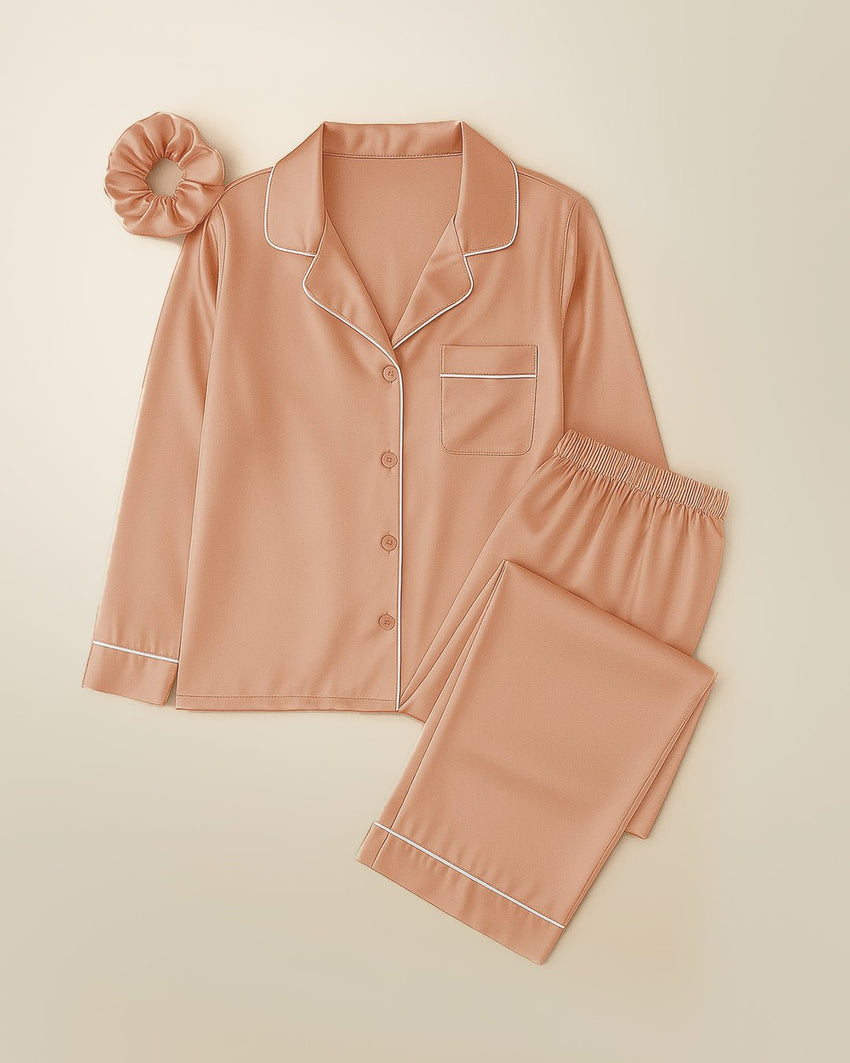 انعمي براحة لا مثيل لها مع طقم بيجاماتنا المزود بأزرار، المصنوع من قماش حريري ناعم الملمس ينساب بسلاسة على بشرتكِ. صُمم هذا الطقم ليجمع بين الراحة والأناقة، وهو مثالي لأمسيات دافئة في المنزل أو صباحات هادئة في المنزل.